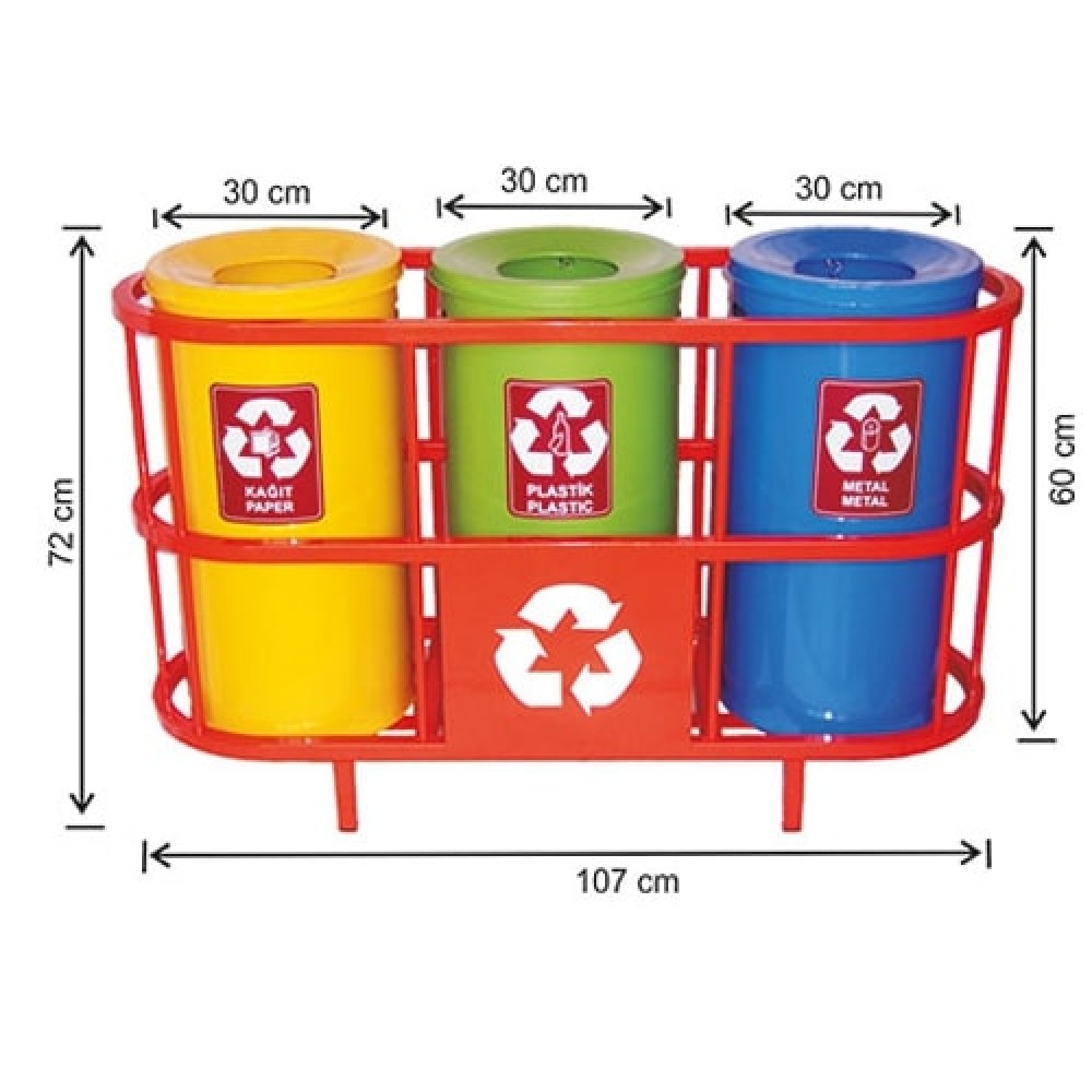 1806 Kafesli Boyalı 3 Bölmeli Sıfır Atık Geri Dönüşüm Seti