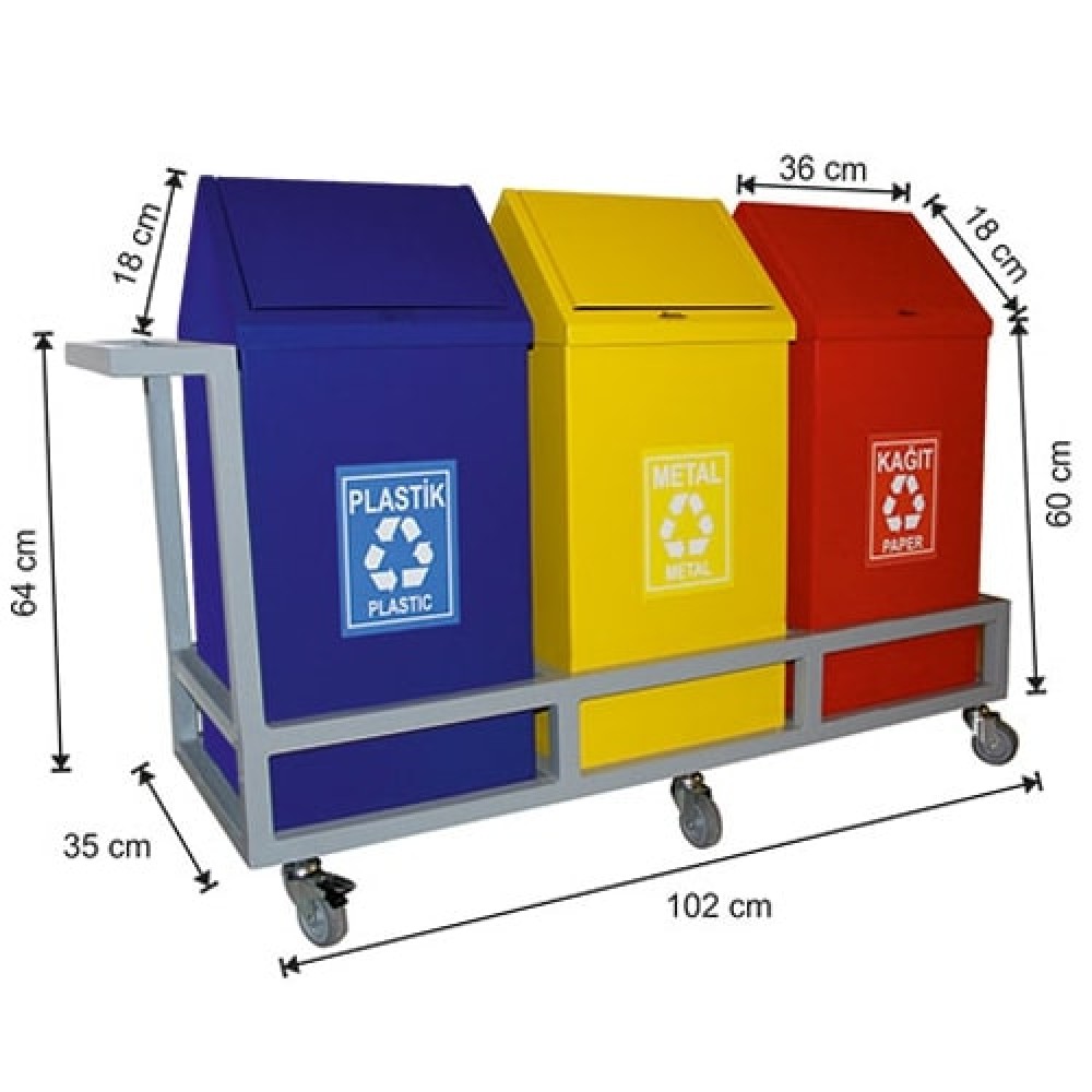 1862 Kafesli Tekerlekli Boyalı 3 Bölmeli Sıfır Atık Geri Dönüşüm Seti